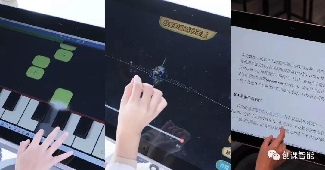 趣味学习——基于虚拟实验平台,孩子可以在智能课桌上进行各种科学实验,认识天体物理现象等,培养科学兴趣爱好,并强化动手操作能力;人工智能编程,手势拖拽交互,趣味编程培养计算思维;超大屏幕绘画场景,笔触真实细腻,手眼不分离;电子琴房场景,识音学乐理,培养音乐素养......丰富的应用场景,为素质教育创造良好的生态环境。